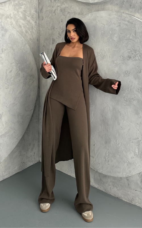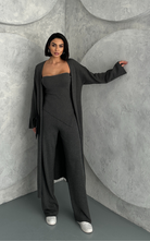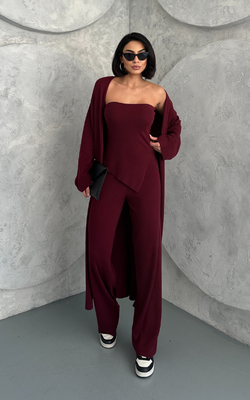 Elevate your look with our Pinterest Set, featuring a strapless top, comfy knit pants, and a long cardigan. Perfect for any occasion, this versatile ensemble offers endless styling options!