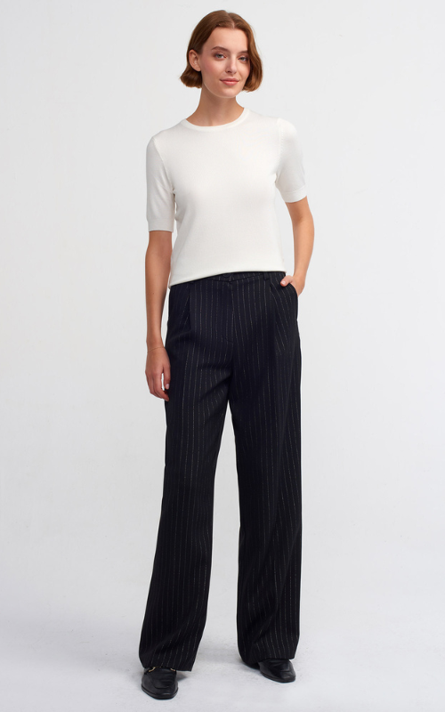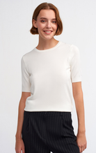 Classic knit t-shirt featuring a round neckline and short sleeves that reach slightly above the elbow.