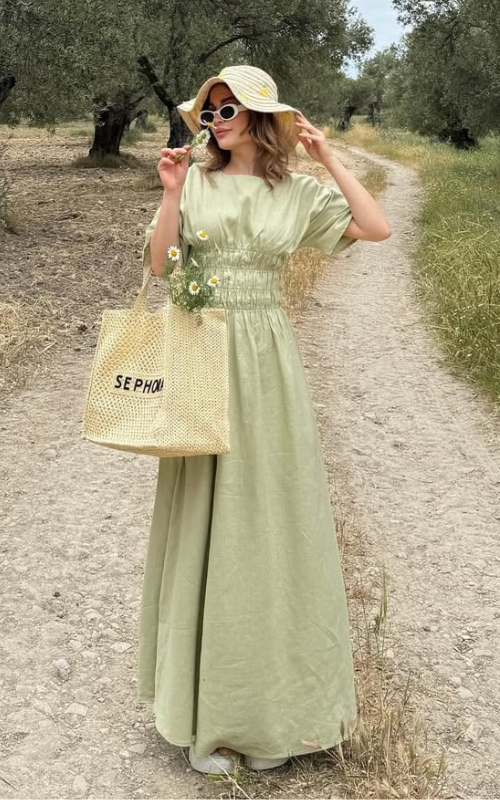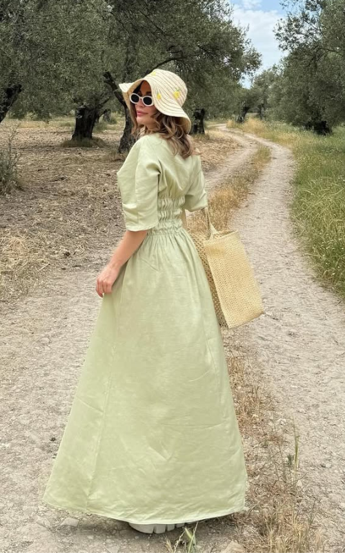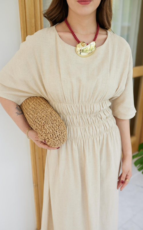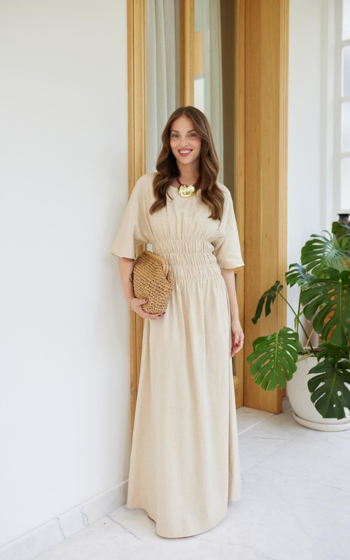 The Rachel Dress is a midi dress featuring short sleeves, a round neckline, and a smocked waistline for a flattering and flexible fit. The skirt falls in soft pleats and finished with a back zipper.