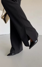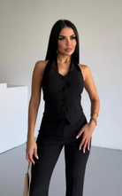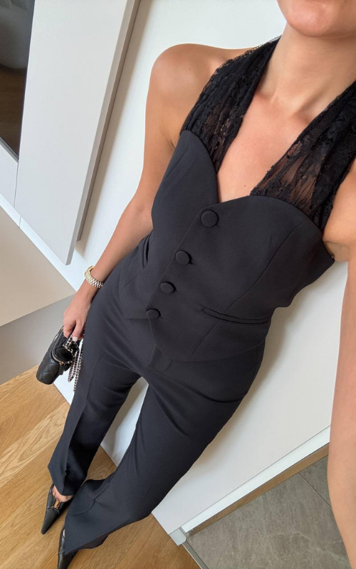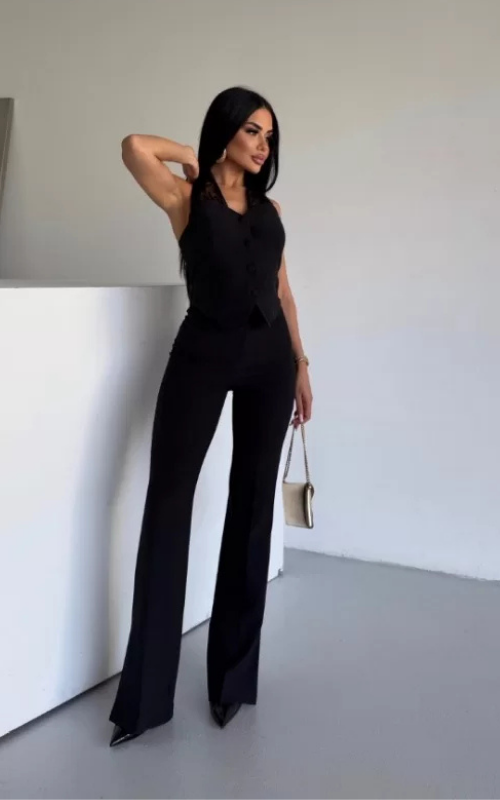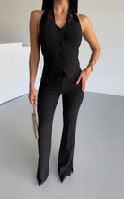 This set features a princess-cut corset with delicate front buttons and lace halter detailing that adds a touch of softness to its structured silhouette. Paired with flared pants for a balanced, feminine finish that moves with confidence.