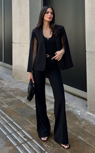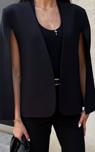 The Raven Blazer features dramatic split sleeves and an open front in a sleek cape style. Crafted from premium fabric, it delivers a bold, standout look.
