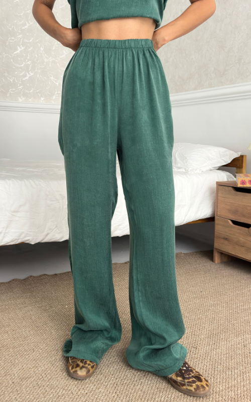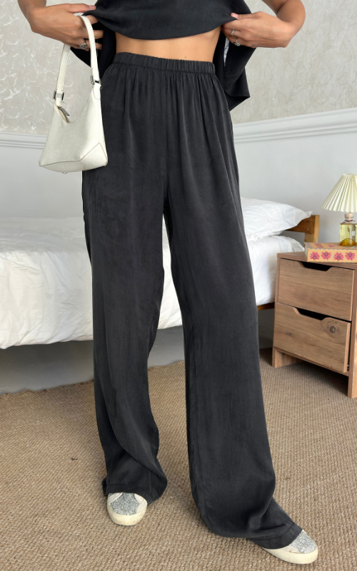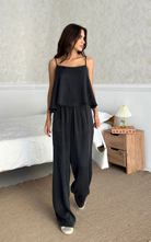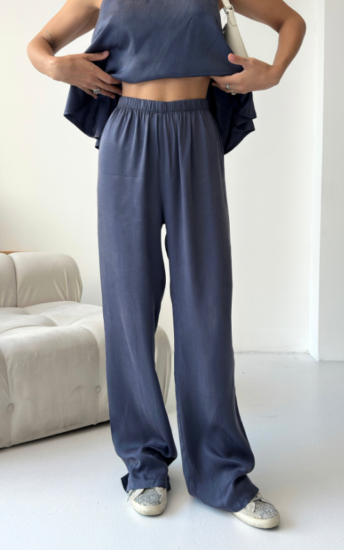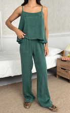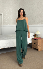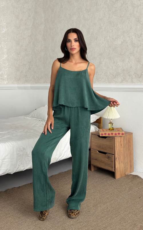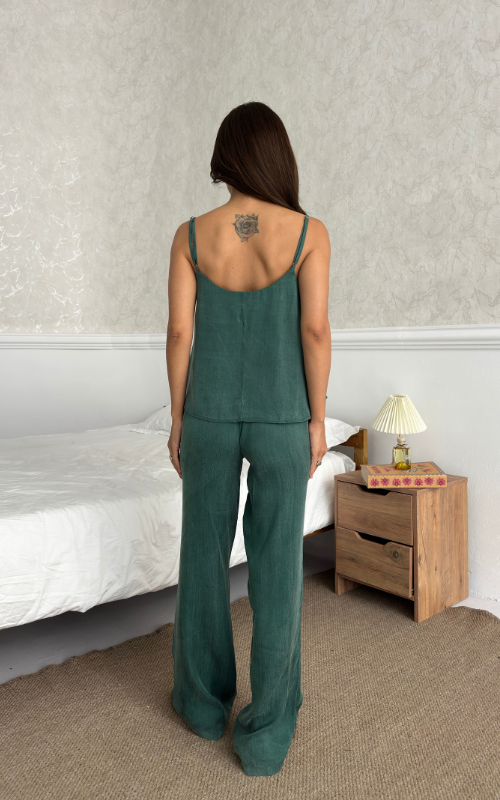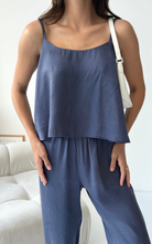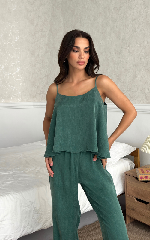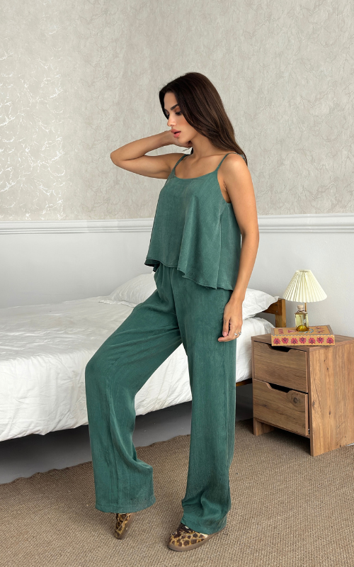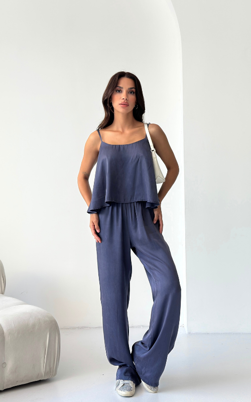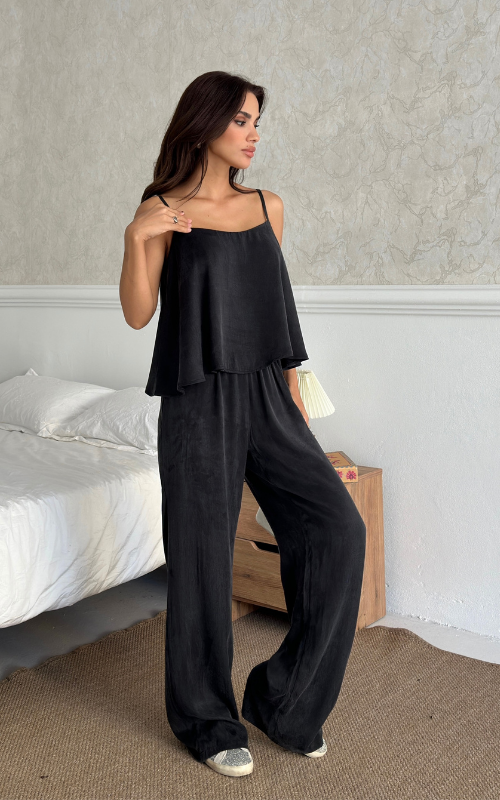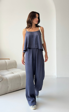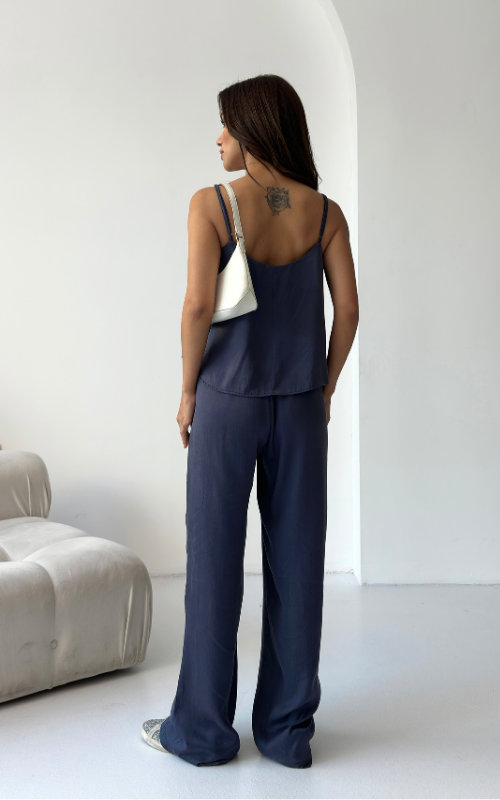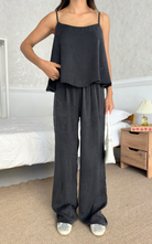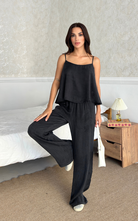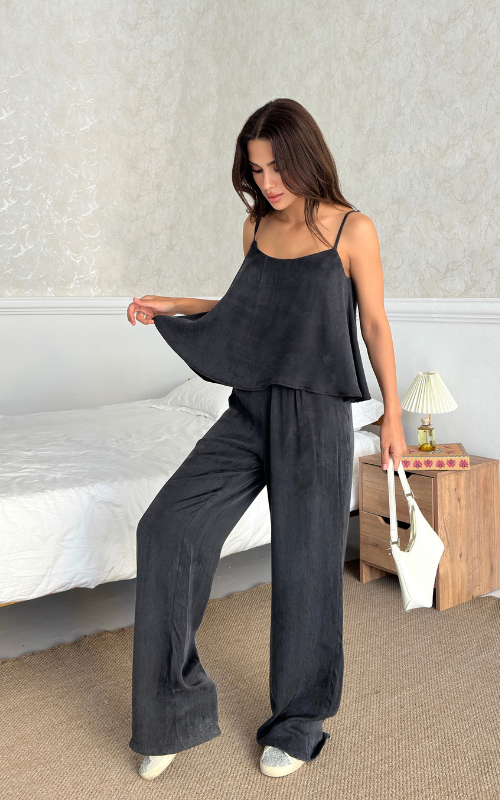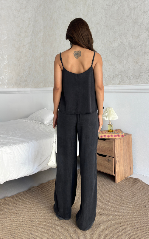 The Relax Set features an airy camisole with adjustable straps and a flowy silhouette that drapes for a flattering fit. Paired with a wide-leg trousers, designed with an elastic waistband.