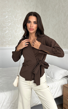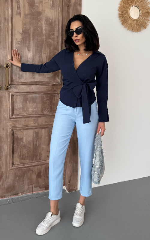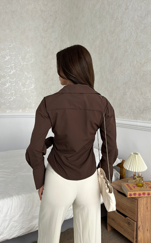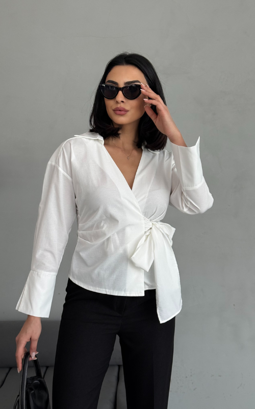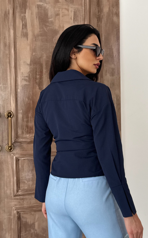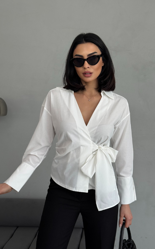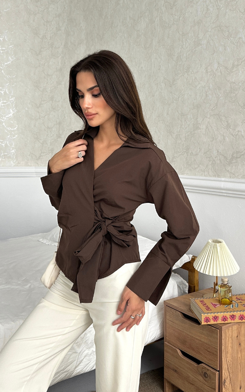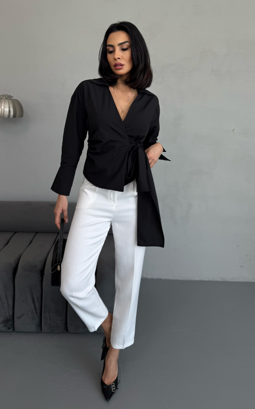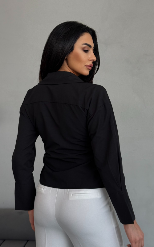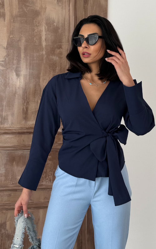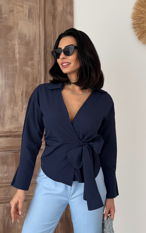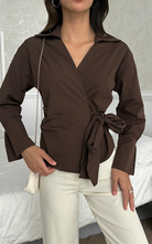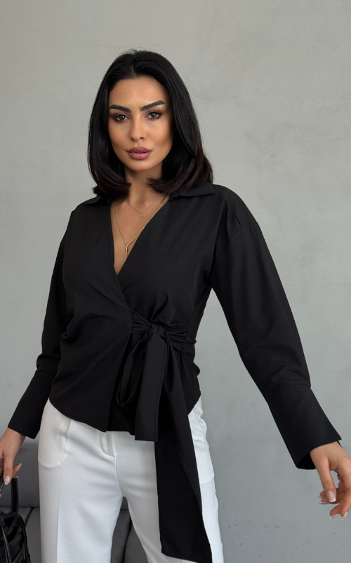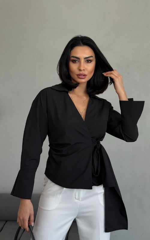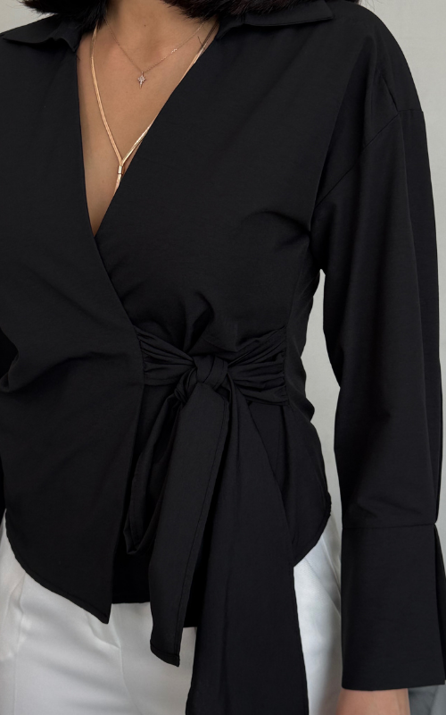 Our Ritual Top features a wrap-over side tie front design, a plunge neckline, and a crafted collar. The long sleeves have a unique slit design at the wrist cuffs.