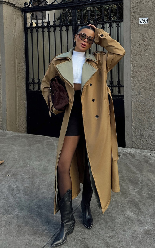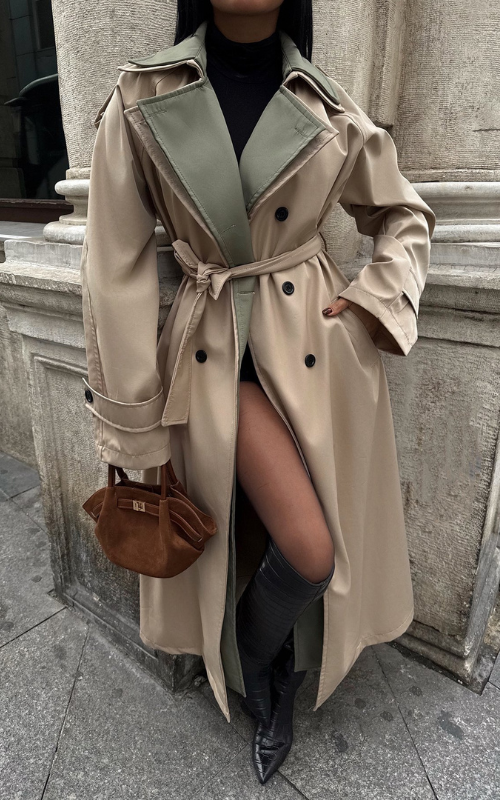 Our Roxy Coat is a sophisticated long trench coat featuring a contrast color collar and wrists, adorned with premium buttons and crafted from luxe fabric for an elegant, polished look.