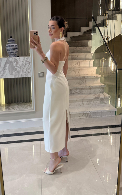 The Vida Dress is a feminine midi-length piece with a sleek halter neck and square neckline, blending elegance and charm for a stylish look.