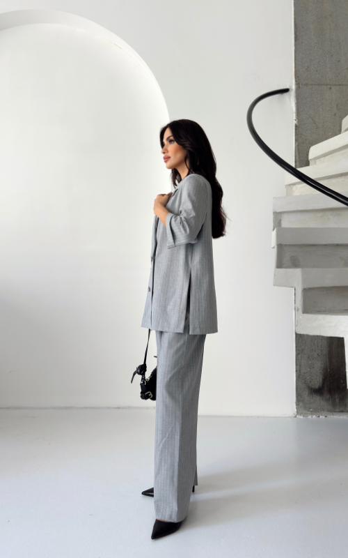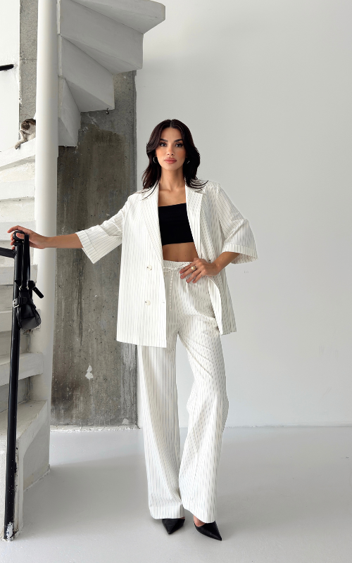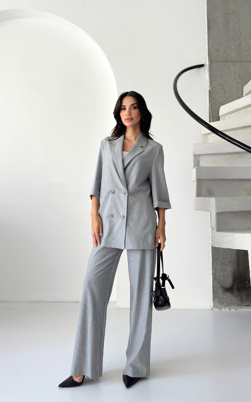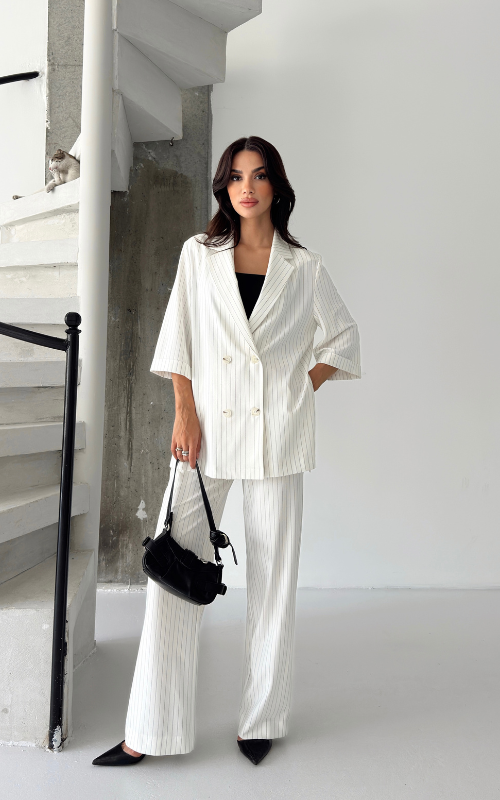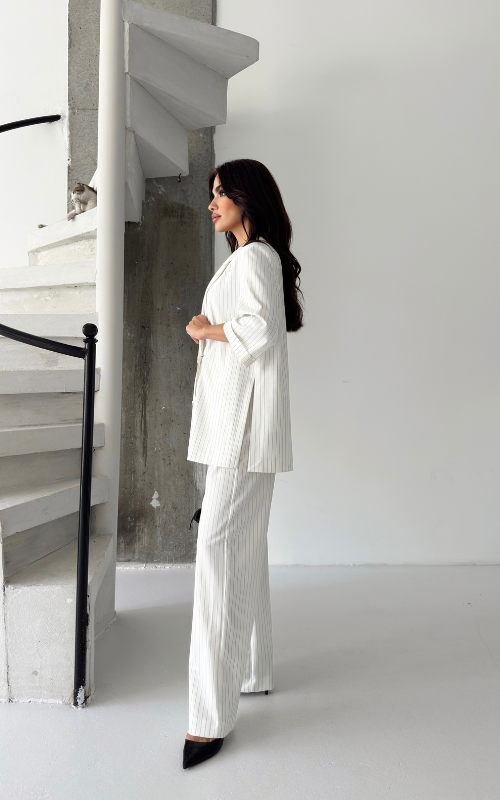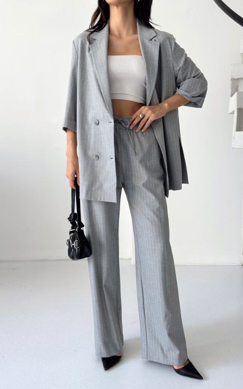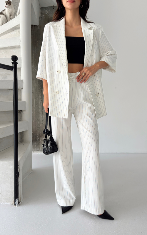 Set featuring a double breasted blazer in flow fabric and side slit for extra movement. Paired with a high waisted, straight cut pant with and adjustable drawcord waistband.