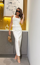 The Samana Set includes a halter neck top with a square neckline, paired with a skirt featuring a front slit, two flap pockets and an invisible hook buckle closure.