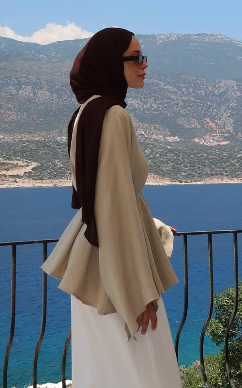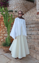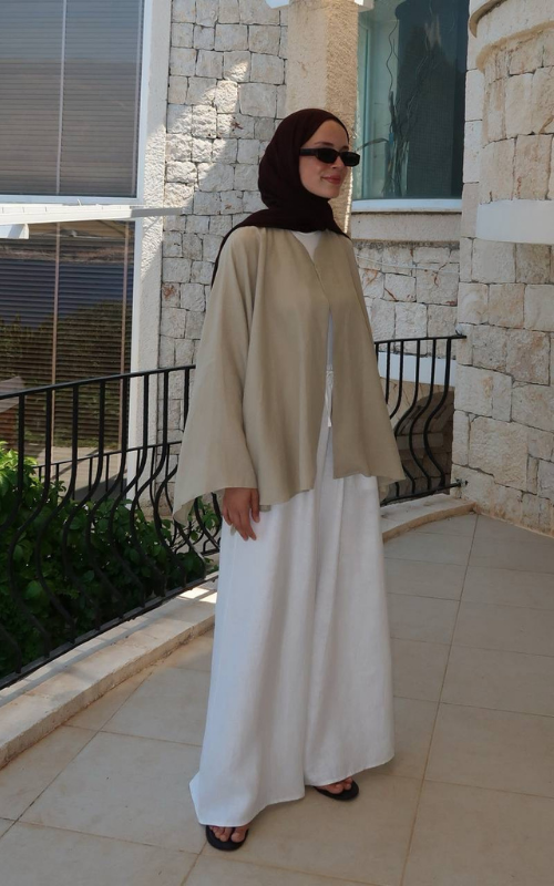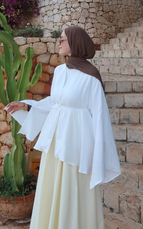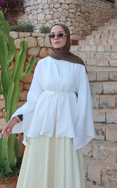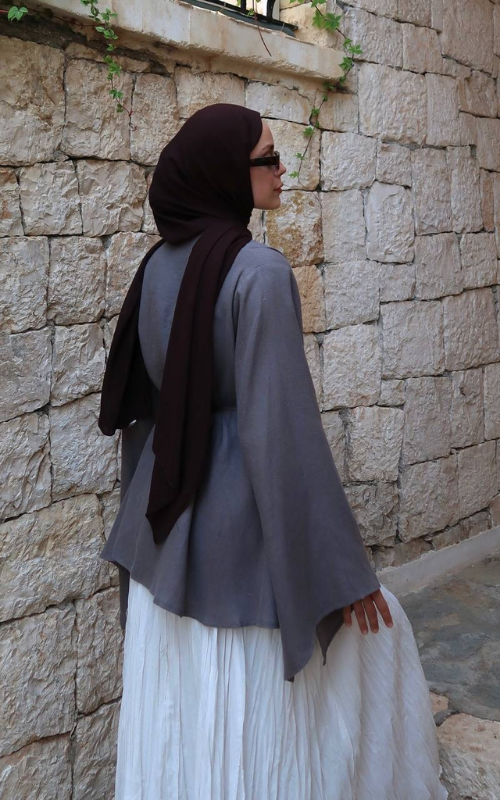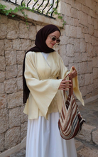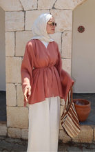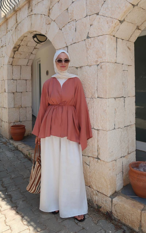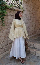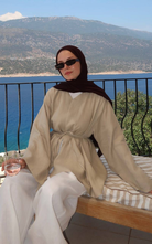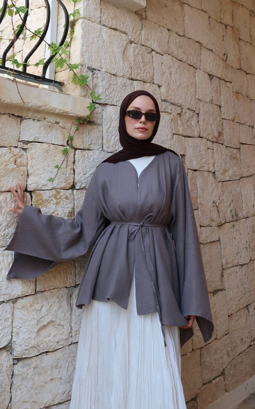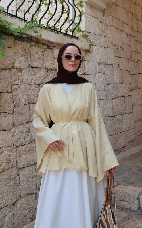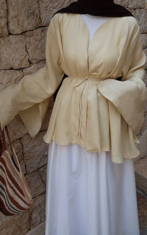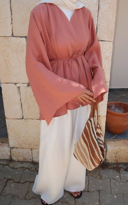 The Samar Cardigan is a kimono-inspired blouse with a relaxed silhouette, featuring a soft open front that can be cinched at the waist with a tie belt. It has a wide, draped sleeves and flared hemline.