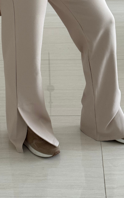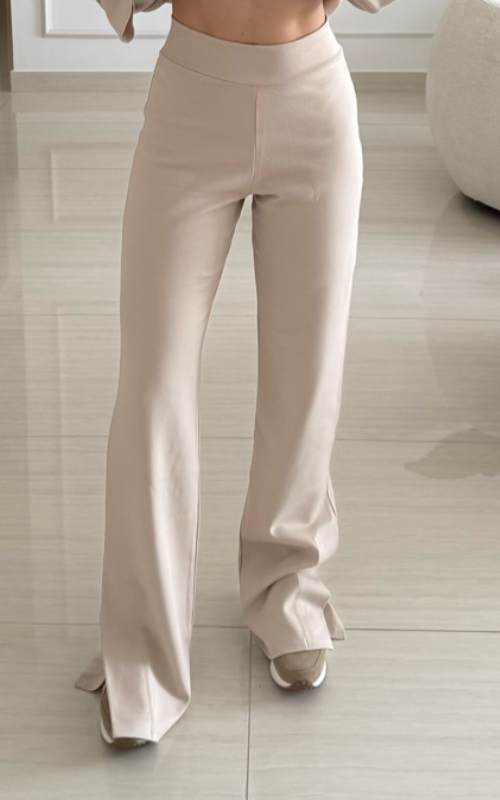 High-waisted pants with a thick waistband and straight-cut legs with a side slit on the hems for a sleek look. The fabric contains organic cotton and elastane.