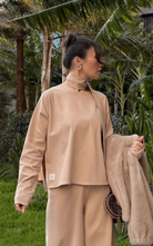 Long sleeve top with straight sleeves and hems, high side slits, and a front hem shorter than the back. The sleeves are attached with a rectangular cut for a unique touch. Finished with a matching scarf. The fabric contains organic cotton and elastane.
