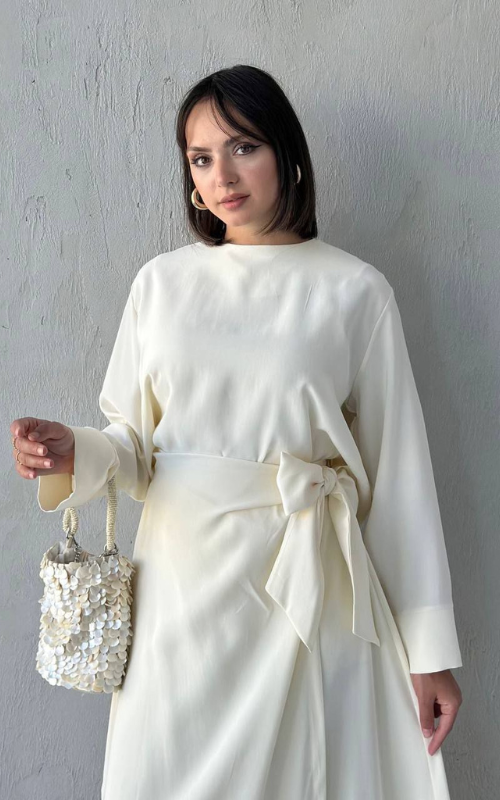 The Sherry Set is a full-length, modest outfit designed with a clean, minimalist silhouette. It features a soft, flowy fabric, long sleeves, and a wide waist tie. The overlap wrap detail adds movement and grace.