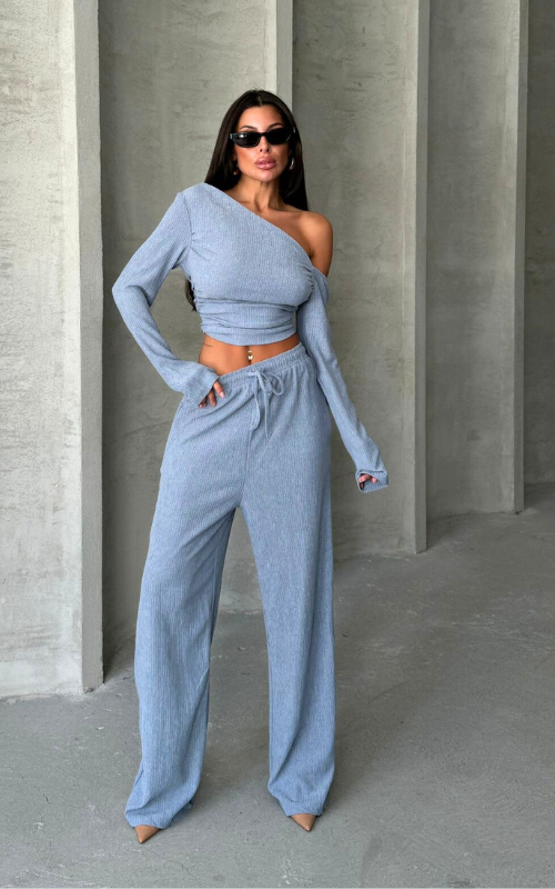 Our Jenny Set features an off-shoulder crop top paired with drawstring pants. The top's off-shoulder detail adds a touch of sophistication, while the pants ensure an easy wear.