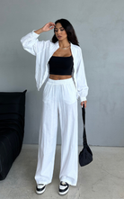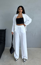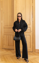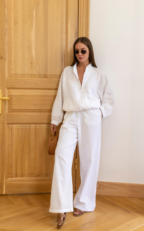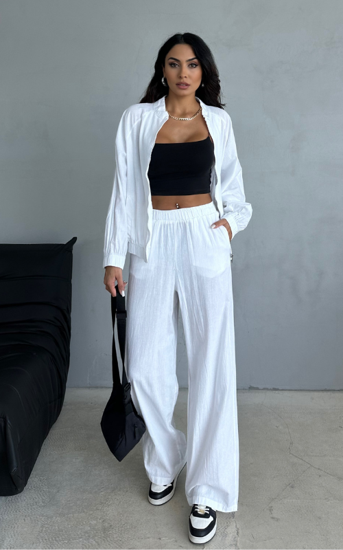 The Sofia linen set features a sleek pant and zipper jacket combination, designed for effortless elegance. Crafted from lightweight linen, this set offers breathability and comfort, making it perfect for warm weather outings. The modern zipper detail adds a stylish touch, ideal for both casual and chic occasions.