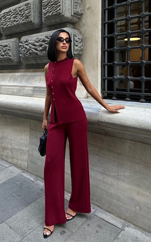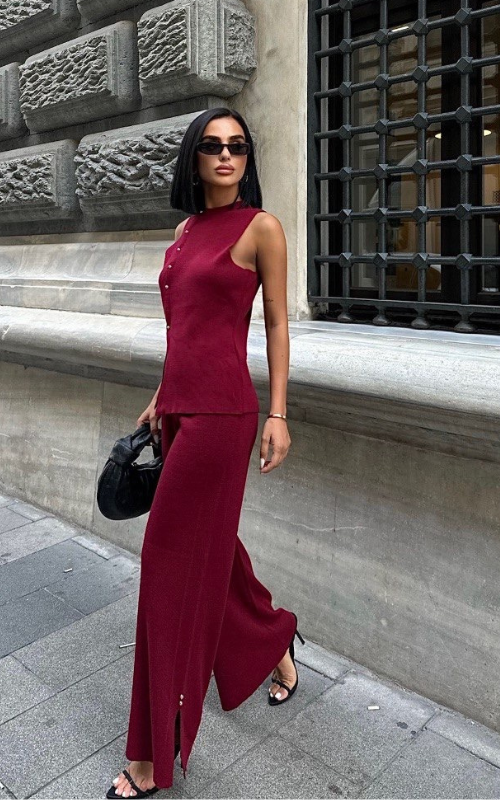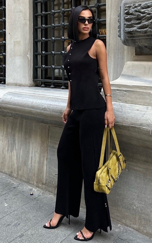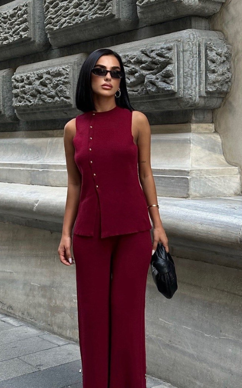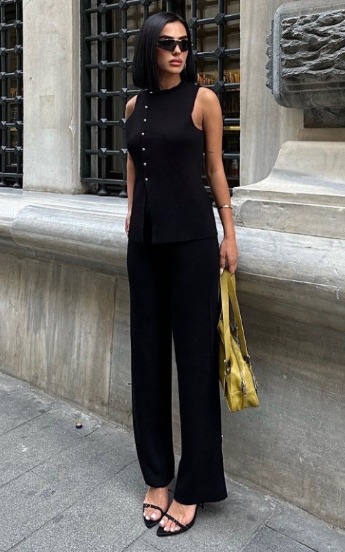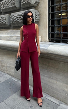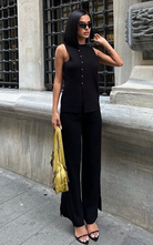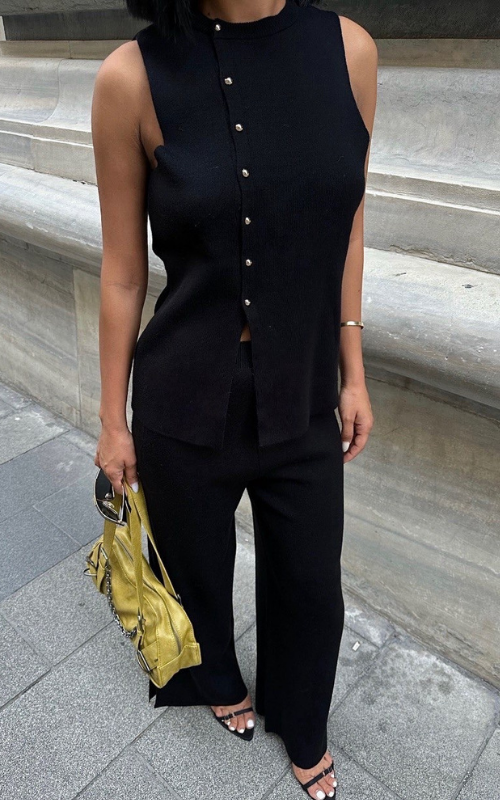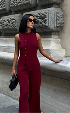 Standout from the crowd with our Soho Set, featuring a flattering sleeveless top adorned with metal button details and perfectly tailored pants, an ideal choice for a polished look.
