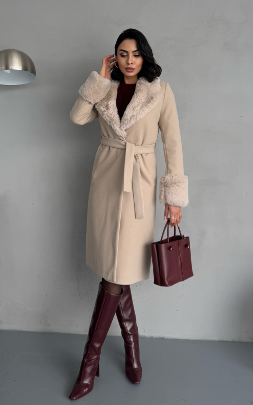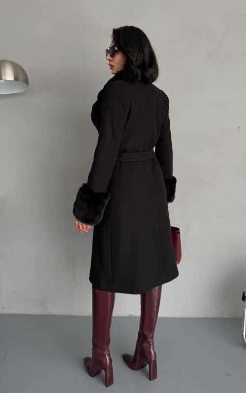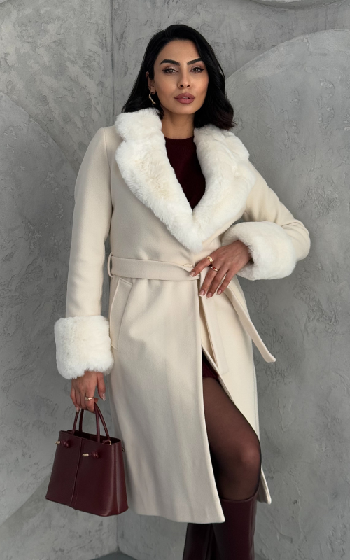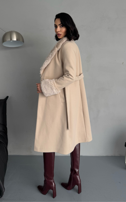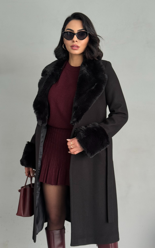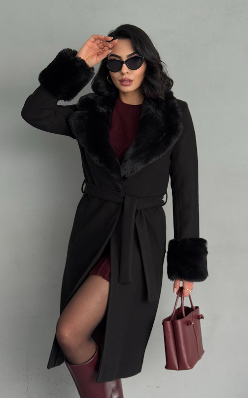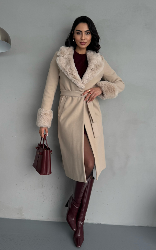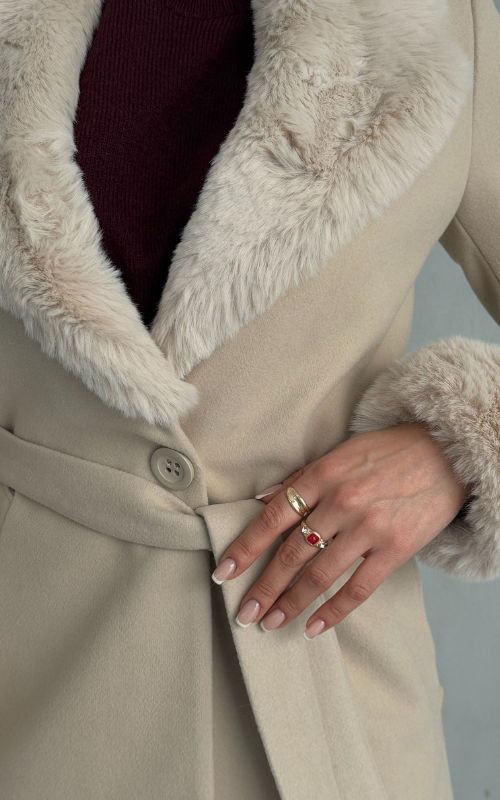 Turn heads with the Sola Luxe Jacket, a stylish midi-length jacket featuring a luxurious fur collar, two faux pockets on each side, and crafted from premium fabric for a chic and sophisticated look.