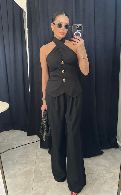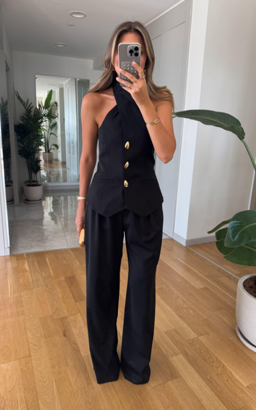 The Sola Set features a halter neck top adorned with delicate metallic buttons, an asymmetric hemline and matched straight-cut pants for streamlined look.