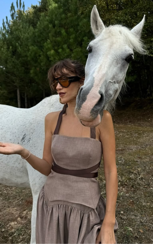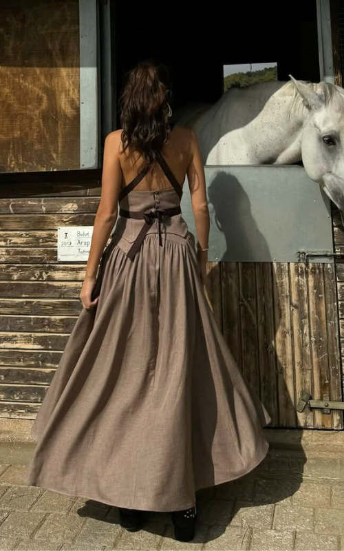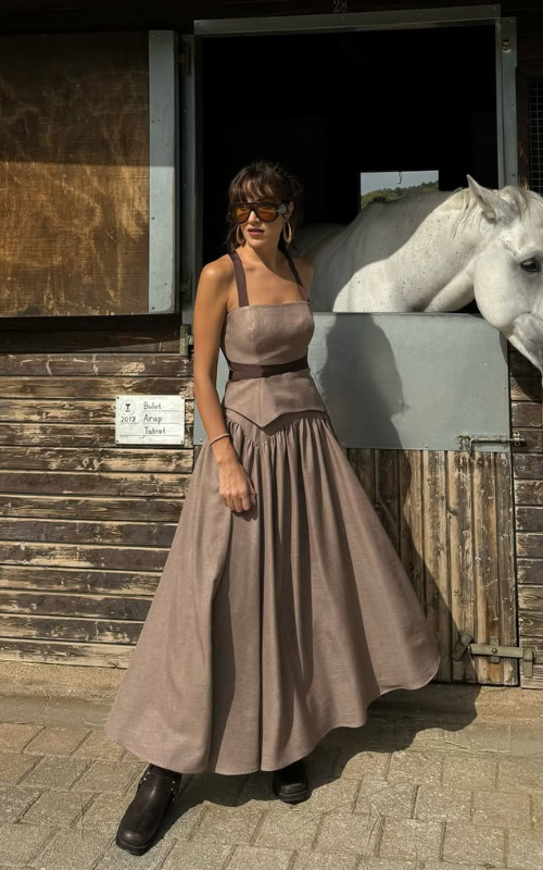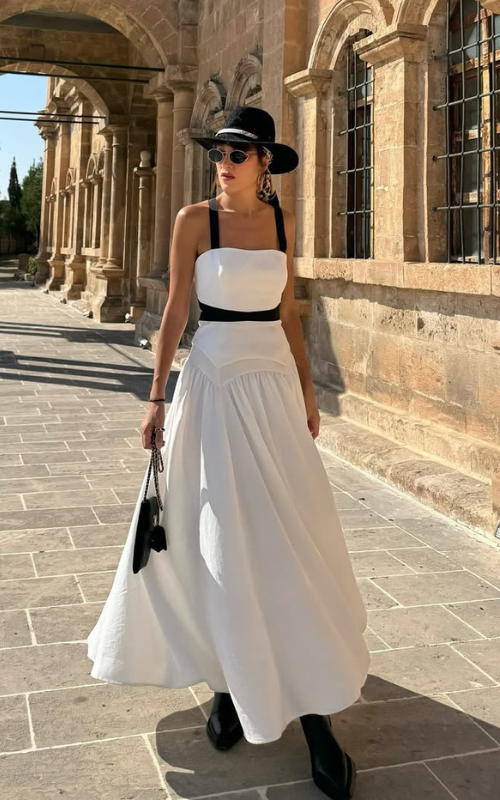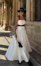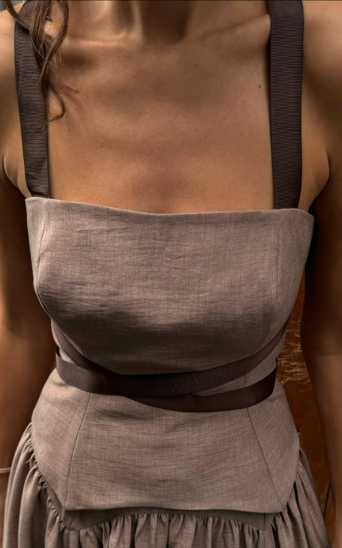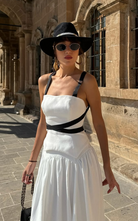 Our Strike Set consists of a corset-style top featuring a square neckline, thick shoulder straps, and contrast bands that define the waist. Paired with an A-line skirt, pleated from the waist to the hemline.