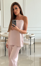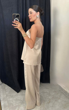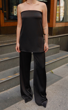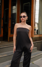The Swan Set features strapless satin top with a flowy, A-line silhouette, paired with wide-leg satin pants for a chic look. The soft sheen of the fabric adds a luxurious touch.