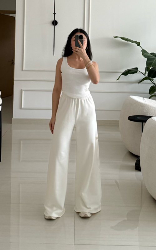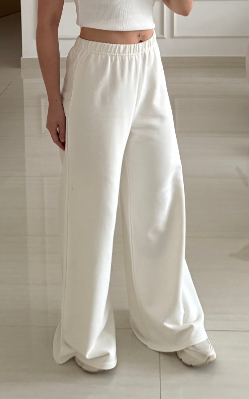Wide leg pant featuring a thin elasticated waistband The fabric contains organic cotton and elastane.