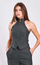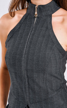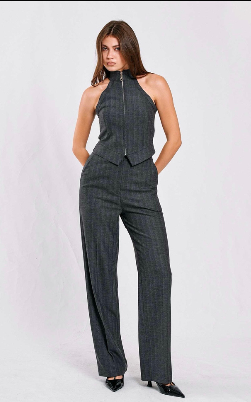 Set featuring a cropped halter top with a center front zipper. Paired with a high waisted. Straight cut pant in the same fabric.