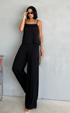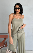 Perfect for casual outings and lounging, our Tanya set comprises of a breezy top that has adjustable spaghetti straps and high-waisted bottoms with drawstring.