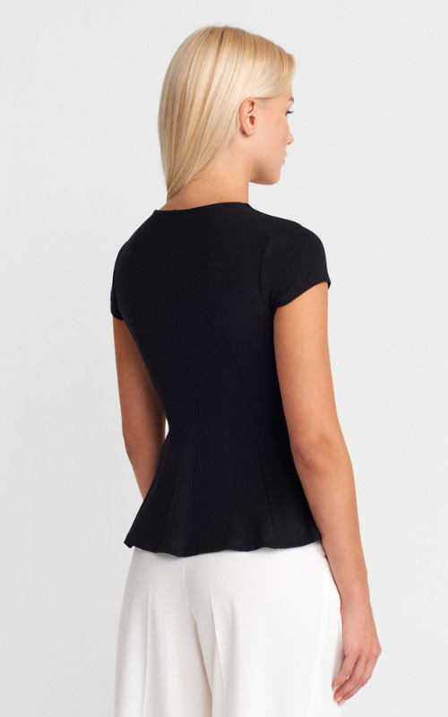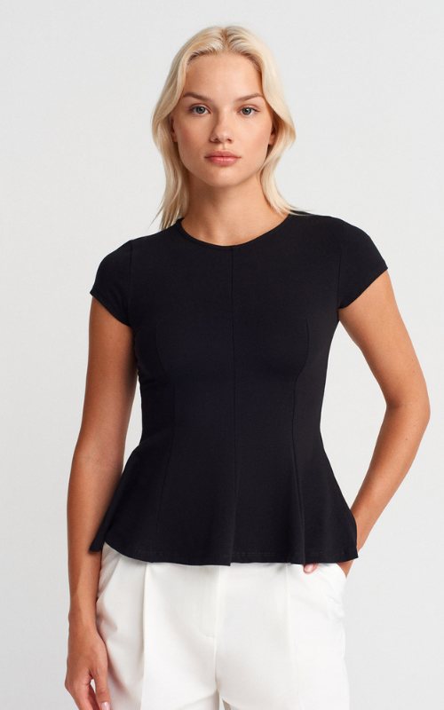Short sleeve top with cap sleeves and round neckline. Darts follow along the bodice and flare at the hemline for a sophisticated silhouette