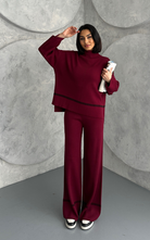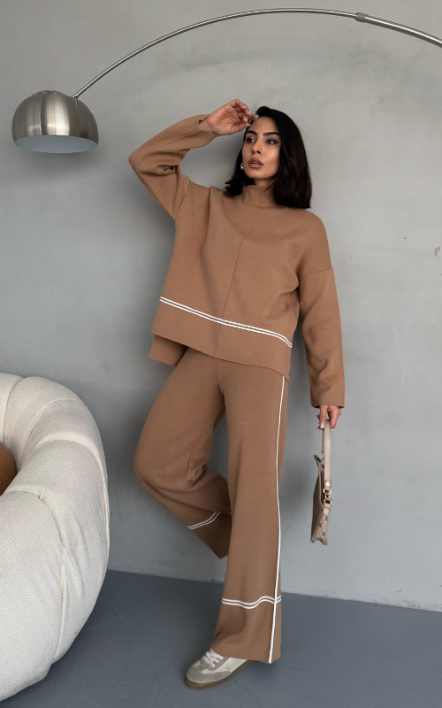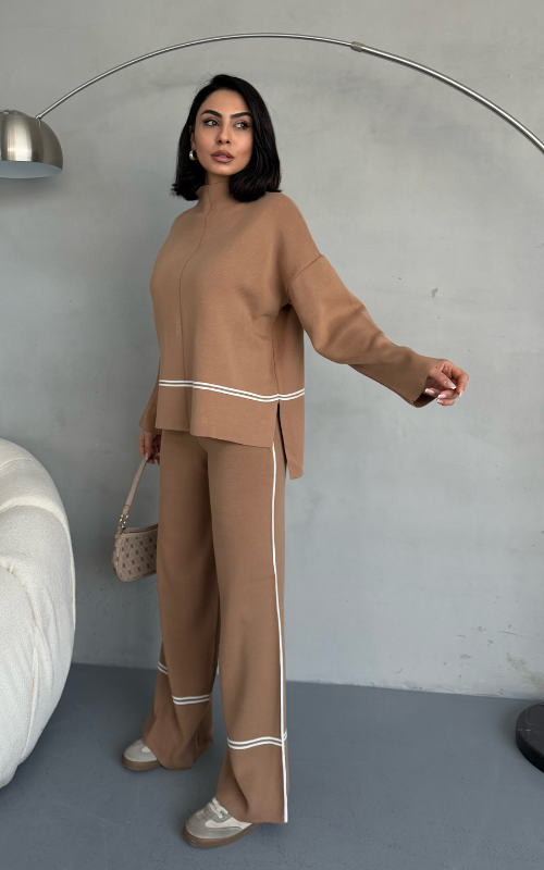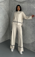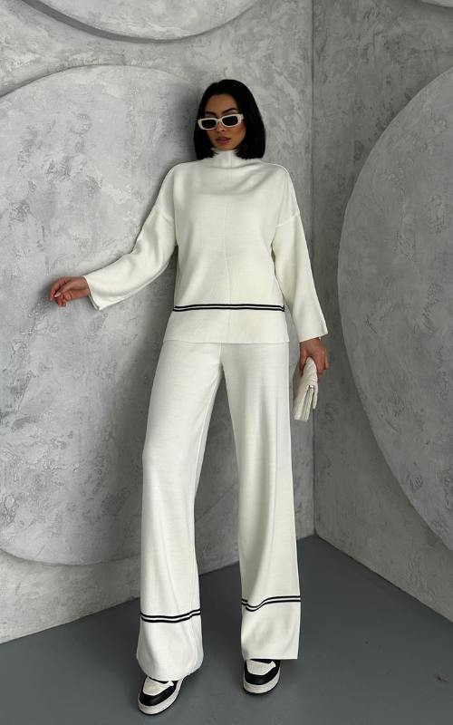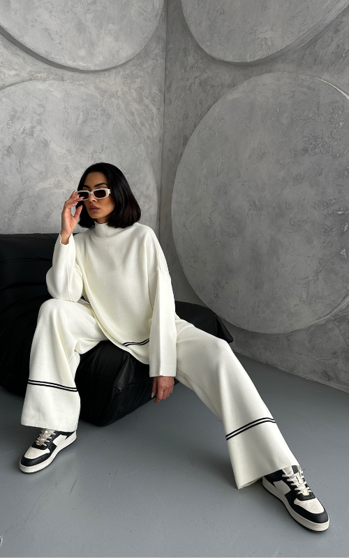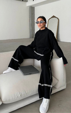 Sleek black top and matching pants highlighted by bold white lines. This modern ensemble is perfect for any occasion, combining comfort and chic sophistication effortlessly.