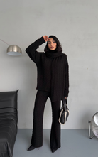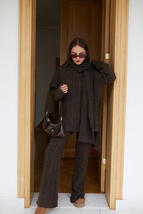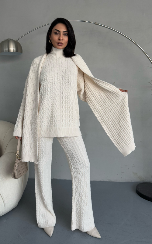 The Vida Set features premium cable-knit matching flowy top, flared bottoms and scarf that is perfect for staying stylish and snug in chilly weather.
