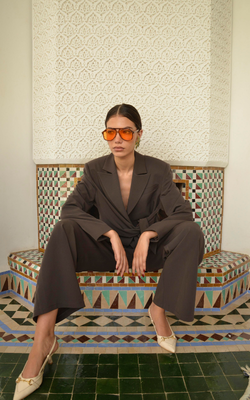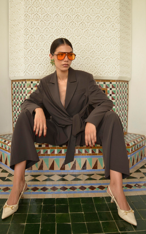 This structured blazer features a front tie detail for a modern twist on classic suiting, paired with wide-leg trousers for a clean, elongated silhouette. A sleek power look with understated edge.