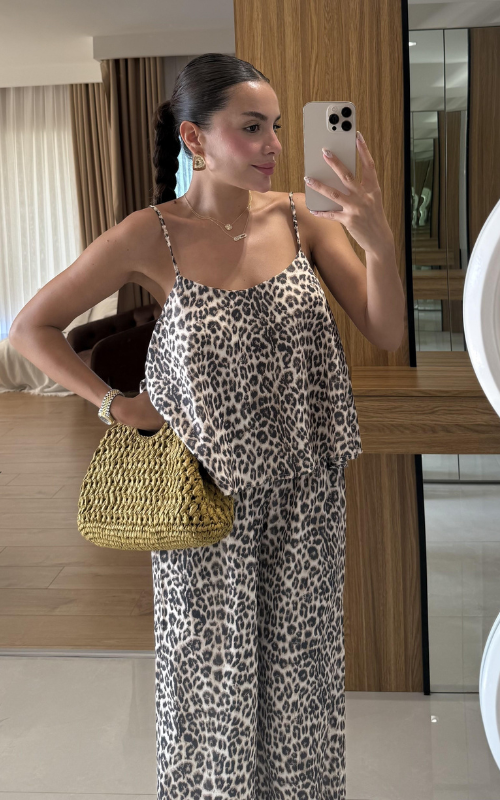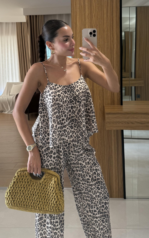 The Zara Leopard Set features a relaxed top paired with straight-leg pants, all in a chic leopard print. This stylish ensemble combines comfort and flair, making it perfect for casual outings or laid-back gatherings.