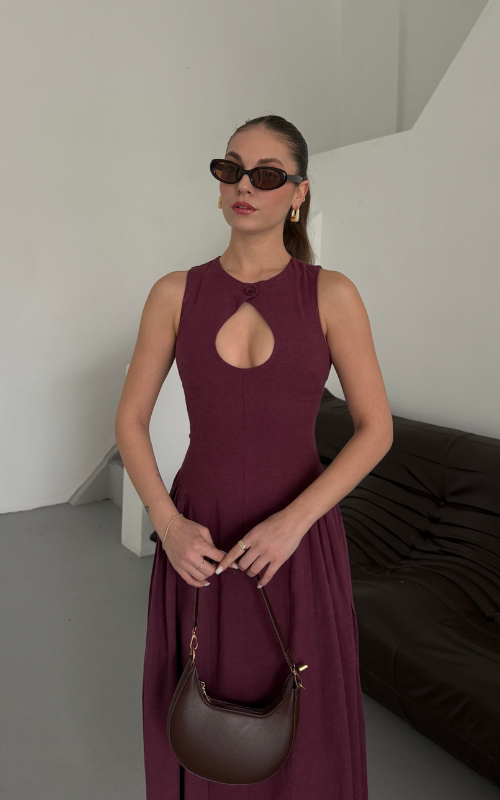 Our Zarina Dress is a sleeveless design featuring a striking chest cut-out and a fitted bodice that beautifully accentuates the waist—perfect for making a bold yet elegant statement.